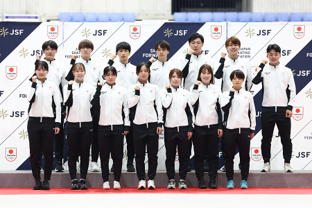 日本スケート連盟は28日、来年2月のミラノ・コルティナ五輪スピードスケート代表の男女各7人を発表した。女子の高木美帆(前列中央)は3大会連続4度目の代表入り=長野・エムウェーブ 【時事通信社】