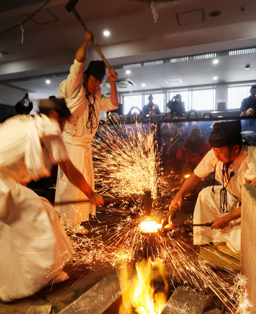 刃物の町として知られる岐阜県関市の関鍛冶伝承館で2日、一年の盛業と無事を願う日本刀の打ち初め式が行われた。 【時事通信社】
