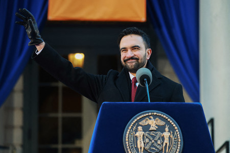 急進左派のゾーラン・マムダニ氏(34)が1日、米ニューヨーク市長に就任した。写真はニューヨーク市庁舎で就任演説を行うマムダニ氏。 【AFP時事】