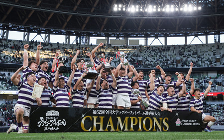 ラグビーの第62回全国大学選手権は11日、東京・MUFGスタジアム(国立競技場)で決勝が行われ、関東対抗戦王者の明大が早大を22―10で下し、7大会ぶり14度目の優勝を遂げた。 【時事通信社】