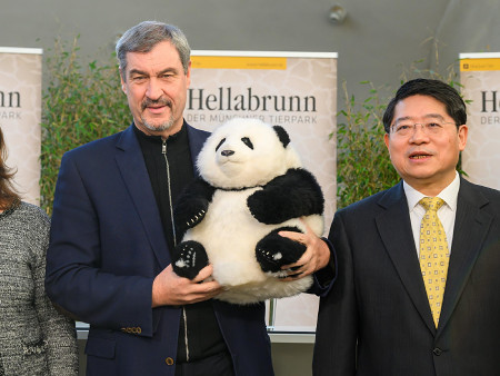 ドイツ南部バイエルン州のゼーダー州首相(左)は21日、同州ミュンヘンの動物園に中国からジャイアントパンダ2頭が貸与されると明らかにした。2028年に到着する予定で、専用の飼育舎が建設される(同州提供) 【時事通信社】