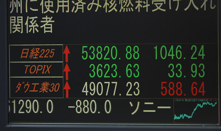 東京株、一時1000円超高