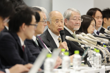 東京五輪・パラリンピックを巡る汚職事件で一審有罪とされた出版大手「KADOKAWA」元会長の角川歴彦被告(中央)が22日、東京都内で記者会見した。 【時事通信社】