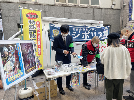 警視庁荻窪署は23日、荻窪駅前で特殊詐欺防止のイベントを行った。「機動戦士ガンダム」とコラボしたクリアファイルなどを配りながら、防犯アプリ「デジポリス」の利用を呼びかけた=東京都杉並区 【時事通信社】