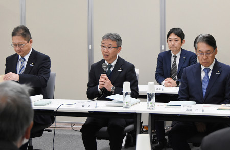 関西電力は27日、美浜原発が立地する福井県美浜町で、地元関係者と原発に関する懇談会を開いた。同町で原発新設に向けた調査を始めた昨年11月以降では初の開催。写真は、あいさつする森望社長(右から3人目)。 【時事通信社】