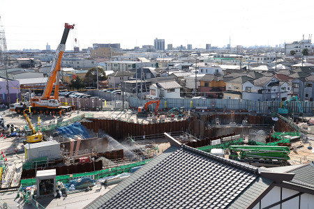 埼玉県八潮市で下水道管が破損して道路が陥没、トラックが転落した事故は28日で発生から1年となった。現場の県道交差点には今も最大幅約30メートルの大穴が開いたままだ。写真は道路陥没の工事現場。 【時事通信社】