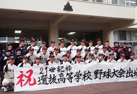 第98回選抜高校野球大会(3月19日開幕、甲子園球場)の出場32校が30日に決まり、21世紀枠の2校は長崎西(長崎)と高知農(高知)が選ばれた。写真は出場が決まり、喜ぶ長崎西の選手たち=長崎市 【時事通信社】