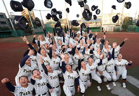 第98回選抜高校野球大会(3月19日開幕、甲子園球場)の出場32校を決める選考委員会が30日、大阪市の毎日新聞大阪本社で開かれた。写真は、出場が決まり喜ぶ帝京の選手たち=東京都板橋区 【時事通信社】