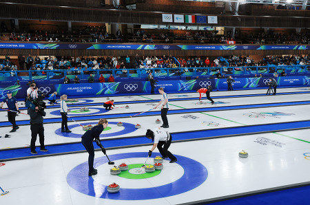 ミラノ・コルティナ五輪は4日、開会式(6日)に先立ち、全競技の先陣を切ってカーリング混合ダブルスの1次リーグが始まった=コルティナダンペッツォ 【時事通信社】