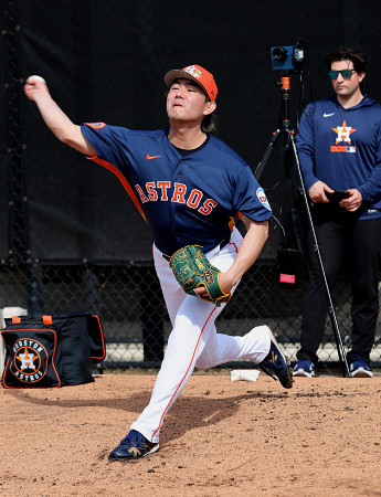 米大リーグの春季キャンプは11日、フロリダ、アリゾナ両州の各地で行われ、プロ野球西武からアストロズに加入した今井が始動した。ブルペン入りし、16球を投げた=フロリダ州ウエストパームビーチ 【時事通信社】