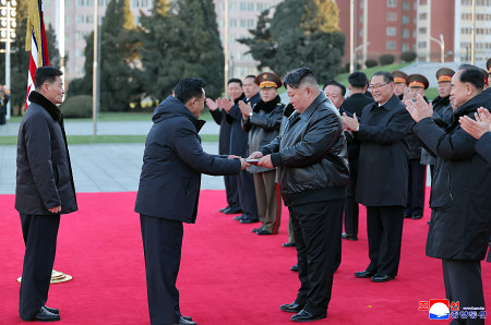北朝鮮の朝鮮中央通信は19日、軍需工業部門の労働者が「600ミリ大口径放射砲(多連装ロケット砲)」を贈呈する式典が18日に平壌で開かれたと伝えた。写真は贈呈書を受け取る金正恩朝鮮労働党総書記(中央)。 【朝鮮通信・時事】