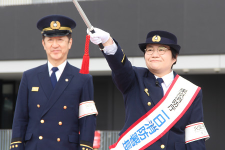 3月から始まる春の火災予防運動を前に、東京消防庁は24日、ハリセンボンの近藤春菜さんを深川消防署の一日消防署長に迎え、防災訓練を行った。地震による火災の発生を想定し、救出や消火活動などを実施した。 【時事通信社】