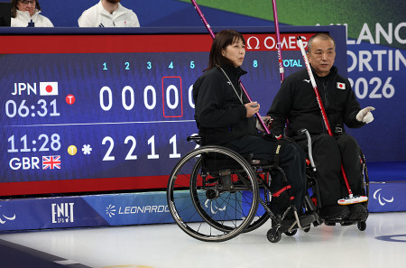 ミラノ・コルティナ・パラリンピック。車いすカーリング混合ダブルス1次リーグの英国戦、作戦を練る小川亜希(左)、中島洋治組。2―11で大敗し、通算2勝3敗となった=7日、コルティナダンペッツォ 【時事通信社】