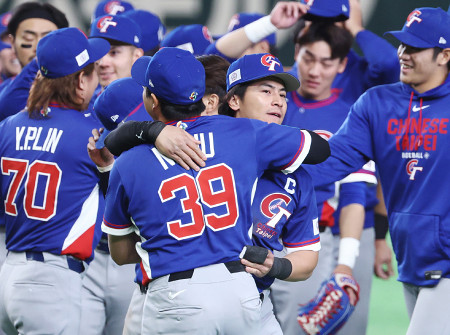 WBCは8日、東京ドームで1次リーグC組が行われ、台湾は韓国に延長10回の末に5―4で競り勝ち、2勝2敗。韓国は1勝2敗。写真は韓国に勝利し、抱き合って喜ぶ台湾の陳傑憲(中央右)。 【時事通信社】