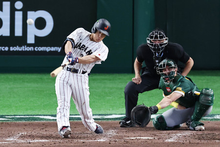 WBCは8日、東京ドームで1次リーグC組が行われ、日本代表「侍ジャパン」がオーストラリアに4―3で勝ち、開幕3連勝として同組1位で準々決勝進出を決めた。写真は7回、逆転2ランを放つ吉田。 【時事通信社】