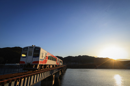 東日本大震災から15年を迎え、朝日を浴びながら鉄路を行く三陸鉄道。大きな被害を乗り越え、復興の象徴となってきた=11日午前、岩手県大槌町 【時事通信社】