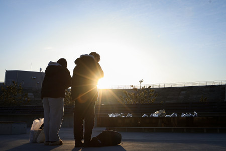 東日本大震災から15年を迎えた11日、朝日を浴びながら手を合わせる大学生=同日午前、岩手県大槌町 【時事通信社】
