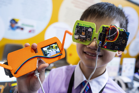 11日、スイス・ジュネーブで開催中の国際発明展で、自身の作品を見せる香港からの参加者。「ゴーグラス」と名付けられた眼鏡は、AIを使用し、画像を音声情報に変換することで視覚障害者の日常生活をサポートする 【EPA時事】