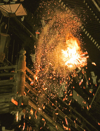 12日夜、「お水取り」で知られる東大寺二月堂の伝統行事、修二会が佳境に入った。僧侶を先導する世話役たちが巨大なたいまつを担いで二月堂に上がり、欄干から火の粉を散らしながら駆け抜け、堂の舞台を照らした。 【時事通信社】