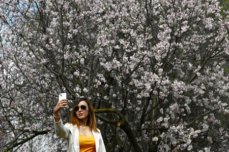 12日、インド北部スリナガルの旧市街にある果樹園で、桜にそっくりなアーモンドの花をバックに自撮りをする観光客。アーモンドは桜と同じバラ科の植物で、桜より一足早く満開を迎える。 【AFP時事】