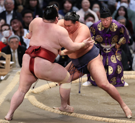 大相撲春場所9日目。横綱豊昇龍(右)は1敗だった隆の勝を下し、連敗を免れて2敗を守った=16日、エディオンアリーナ大阪 【時事通信社】