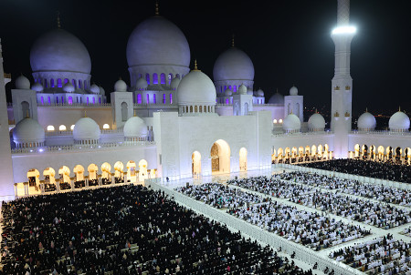 16日、アラブ首長国連邦のアブダビで、モスクに集まって祈りをささげるイスラム教徒たち。ラマダンの開始から27日目のこの夜は、預言者ムハンマドが聖典コーランの最初の節を授かった日を記念する「定めの夜」。 【EPA時事】