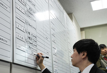2026年春闘は18日、大手企業の集中回答日を迎え、自動車や電機などの各社が相次ぎ、労働組合の要求に満額回答した。写真は回答状況をボードに書き込む金属労協の関係者=東京都中央区 【時事通信社】