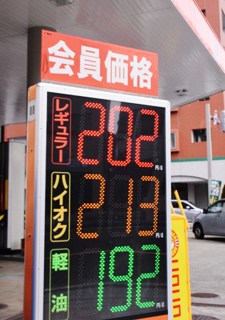 経済産業省が18日発表したレギュラーガソリン1リットル当たりの店頭価格(16日時点)は、全国平均で前週比29円高の190円80銭まで急騰した。写真はガソリンスタンドの価格看板=同日午後、山形市 【時事通信社】