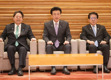 木原稔官房長官は19日の会見で、米国の年次報告書が高市早苗首相の台湾有事を巡る発言を「重大な方針転換」と分析したことについて、「指摘は当たらない」と否定した。写真は閣議に臨む木原氏(中央)ら=首相官邸 【時事通信社】