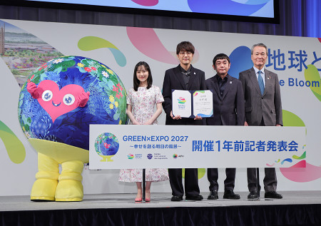 2027年国際園芸博覧会(花博)の開幕まで1年となった19日、東京都内で記念イベントが開かれた。写真は撮影に応じる公式アンバサダーの芦田愛菜さん、「ゆず」の北川悠仁さんと岩沢厚治さんら。 【時事通信社】