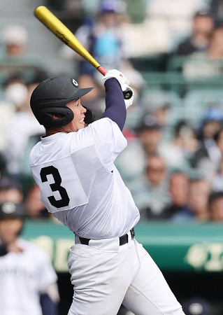 第98回選抜高校野球大会。1回戦が行われ、中京大中京は阿南光を3―1で下し、大会通算59勝目を挙げ、単独最多となった。写真は6回表中京大中京1死、大会第1号となるソロ本塁打を放つ松田=19日、甲子園 【時事通信社】
