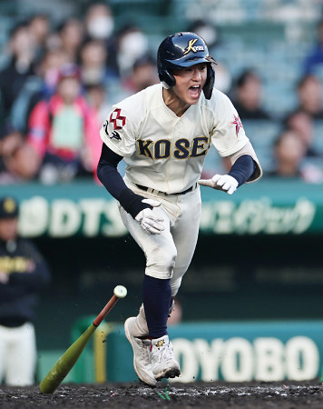 第98回選抜高校野球大会。1回戦が行われ、八戸学院光星は、崇徳を延長10回タイブレークの末に15―6で退けた。写真は、延長10回表八戸学院光星無死満塁、勝ち越しの適時打を放ち喜ぶ佐々木=19日、甲子園 【時事通信社】