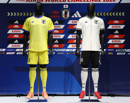 日本サッカー協会は20日、日本代表が着用するアウェー用の新ユニホームを発表した。白を基調としたデザインで、縦に複数の細いラインが入っているのが特徴。 【時事通信社】