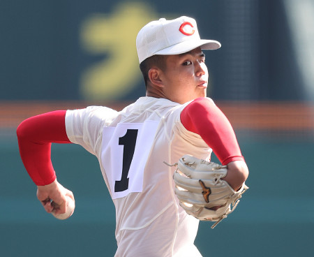 第98回選抜高校野球大会第2日は20日、甲子園球場で1回戦3試合が行われ、智弁学園(奈良)は花巻東(岩手)を4―0で下した。写真は、力投する智弁学園先発の杉本。 【時事通信社】