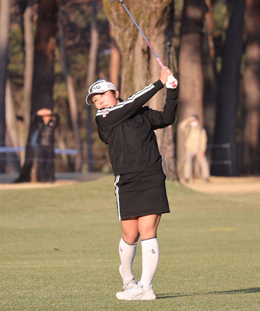 Vポイント×SMBCレディース第2日。全体的にスコアが伸び悩む中、2位から出た昨季年間女王の佐久間朱莉が74と落としながらも通算2アンダーで単独トップに浮上した=21日、千葉・紫CCすみれ 【時事通信社】