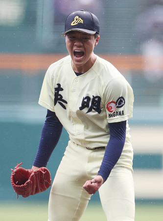 第98回選抜高校野球大会第5日は23日、甲子園球場で1回戦が行われ、東北(宮城)と英明(香川)が2回戦に進んだ。英明は高川学園(山口)を5―3で下した。写真は完投勝利し、喜ぶ英明の冨岡。 【時事通信社】