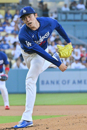 米大リーグのオープン戦。ドジャースの佐々木はエンゼルス戦に先発し、一度降板してから再登板する変則的な形で投げ、計2回で5失点、8四死球の乱調だった=23日、ロサンゼルス 【時事通信社】