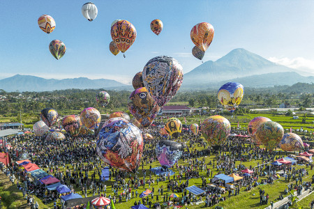 23日、インドネシアの中ジャワ州ウォノソボで、青空に向かって飛んでいく色とりどりの熱気球。イスラム教のラマダン(断食月)明けを祝う行事として、熱気球フェスティバルが開催された。 【AFP時事】