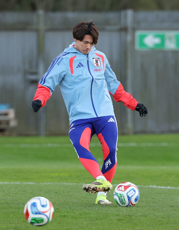 サッカー日本代表は25日、国際親善試合のスコットランド戦(28日=日本時間29日)に向けて、英国のグラスゴー近郊で調整した。写真は練習で汗を流す塩貝。 【時事通信社】