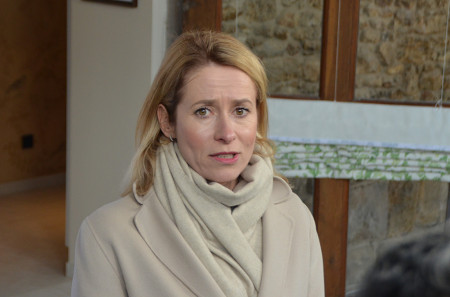 26日、パリ郊外のG7外相会合の会場で、記者団の取材に応じる欧州連合のカラス外交安全保障上級代表(外相)。米イスラエルに対するイランの反撃にロシアが軍事情報やドローン供与で協力しているとの見方を示した 【時事通信社】