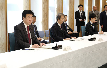 政府は27日、クマ被害対策に関する関係閣僚会議を首相官邸で開き、2030年度に向けて取り組む事項をまとめたロードマップ(工程表)を策定した。写真は会議で発言する木原稔官房長官(左端)。 【時事通信社】