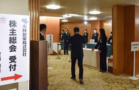 小林製薬は27日、大阪市内で株主総会を開き、筆頭株主の香港系投資ファンド「オアシス・マネジメント」の株主提案を反対多数で否決した。写真は小林製薬の株主総会に向かう人たち。 【時事通信社】
