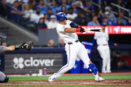 ブルージェイズの岡本はアスレチックスとの開幕戦に7番三塁で出場し、3打数2安打、1四球、1三振だった。9回は2死走者なしから右前打を打って3―2のサヨナラ勝ちに貢献した=27日、トロント 【AFP時事】