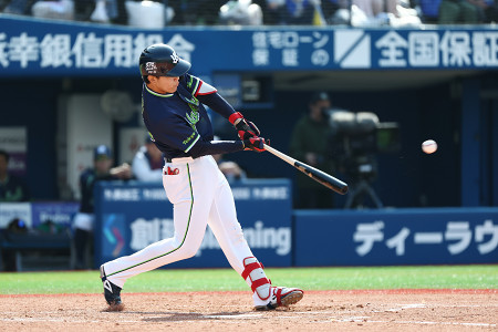 ヤクルトが開幕2連勝。1―1の3回に鈴木叶(写真)の適時二塁打と岩田の左前適時打、橋本の犠飛で3点を勝ち越し、7回にはサンタナの適時打で加点した。山野が7回2失点で勝利投手=28日、横浜 【時事通信社】
