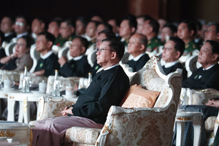 ミャンマー中部を震源とする大地震の発生から28日で1年を迎えた。写真は、首都ネピドーで開かれた地震の追悼式に出席するミャンマー国軍のミンアウンフライン総司令官(中央)。 【EPA時事】