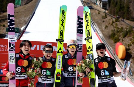 ノルディックスキーのワールドカップ(W杯)ジャンプ男子。団体戦で2位に入り、表彰式で喜ぶ日本の(左から)中村直幹、内藤智文、小林陵侑、二階堂蓮=28日、スロベニア・プラニツァ 【ロイター時事】