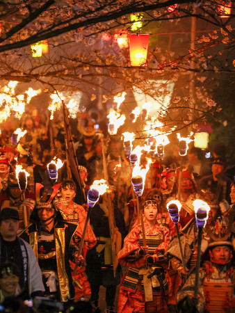 長崎県雲仙市千々石町で28日、武士に扮(ふん)した総勢150人がたいまつを持って桜並木の下を練り歩く「観櫻火宴(かんおうかえん)」が行われた。地元の有志が橘公園周辺の夜桜を広報するため始めた火祭り。 【時事通信社】