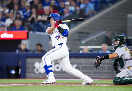 ブルージェイズの岡本はアスレチックス戦に4番三塁で出場し、5打数1安打、2三振だった。開幕から2試合連続安打。チームは延長11回、8―7で2試合連続のサヨナラ勝ち=28日、トロント 【AFP時事】