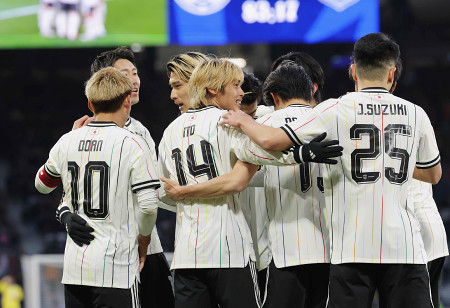 サッカーの国際親善試合は28日、英国のグラスゴーで行われ、世界ランキング19位の日本代表は、同38位のスコットランド代表を1―0で退けた。写真は後半、先制ゴールを決め、喜ぶ伊東(中央手前)ら。 【時事通信社】