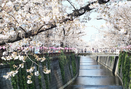 見頃を迎え、見物客で賑わう目黒川の桜並木=29日、東京都目黒区 【時事通信社】